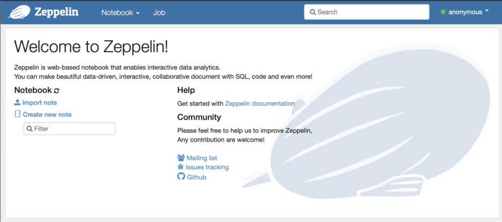 For a full local installation of zeppelin the official docs recommend that you download the binaries and run these against a (local or otherwise) spark installation, however for trialing out the stack and for situations where you don’t need a full scale cluster, it’s docker to the rescue.