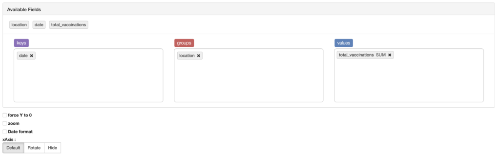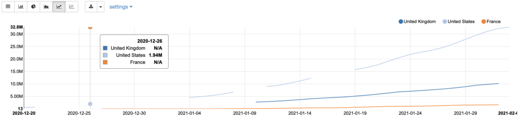 Still, this is hardly ideal and leads us nicely into the fantastic data visualisation support that zeppelin gives us. In the block where we generated our dataframe containing the total vaccinations by data and country earlier, you’ll see we also created a view using the createOrReplaceTempView function; this creates a view against which we can run good old fashioned sql to query and visualise our data. Simply add in %spark.sql in at the top of your block and you’re good to go: